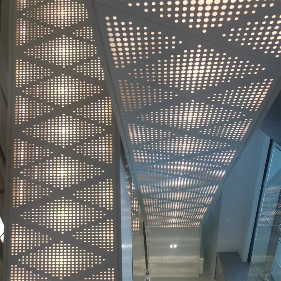 這位老板是采用我廠磚塔沖工藝做的吊頂沖孔板材質為鋁合金材質優點是輕不生銹對客人在極端情況下安全好不容易傷到人,沖壓好后在折彎到了現場拼裝目前從圖片效果看特別美觀吧,圖案為大小孔組成,里面有暗燈,整體氣...